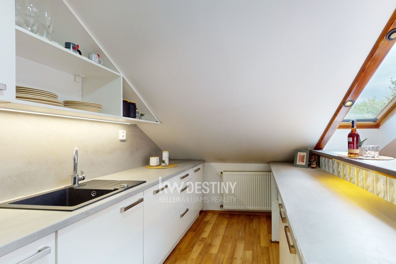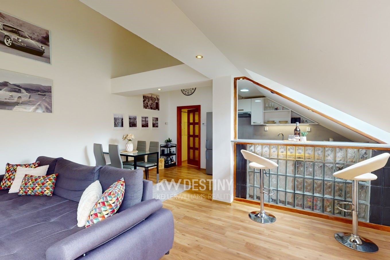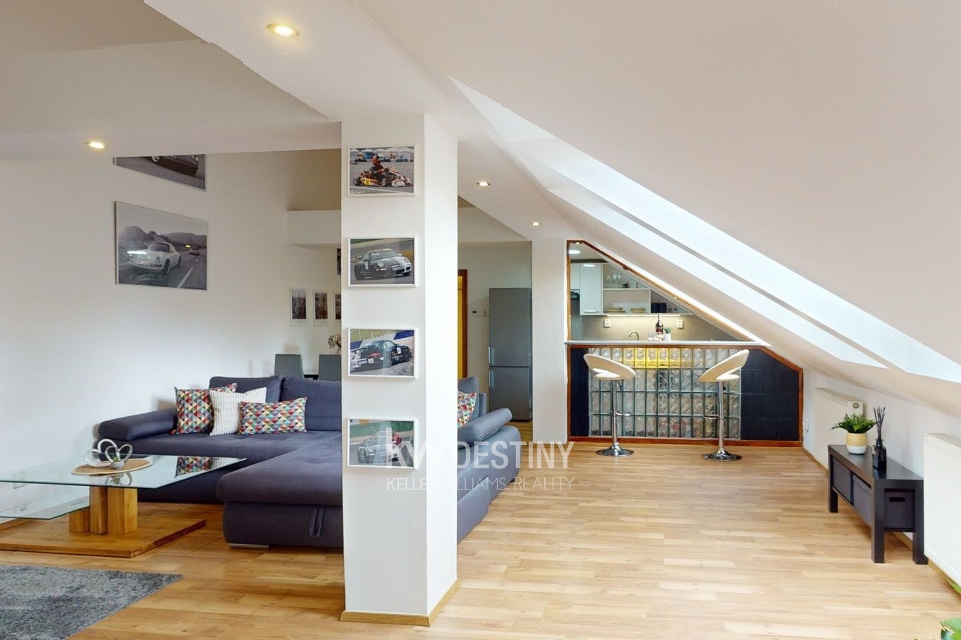 Kuchyňská linka na míru ve vyšším standardu je vybavena elegantním proskleným barem a všemi potřebnými spotřebiči – elektrická trouba a sklokeramická deska, digestoř a vestavná myčka. V bytě zůstává rovněž pohodlný gauč, televizní stěna, skříně, postel i s matracemi. Podlahy jsou plovoucí, okna plastová i střešní dřevěná, osazená vnitřními roletami typu plisé a den-noc. Interiérové dveře kombinují masivní dřevo s kvalitními MDF obložkami.