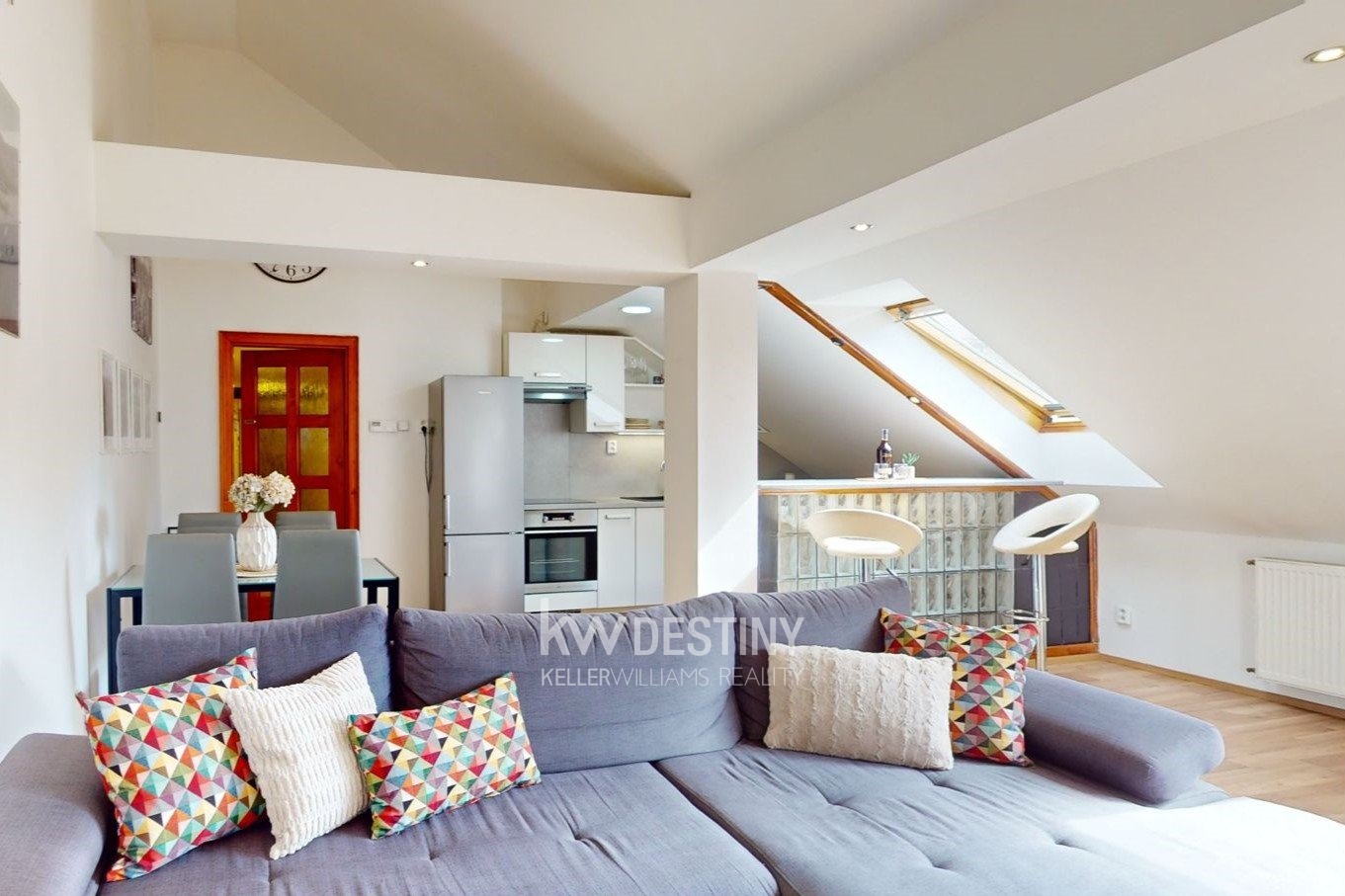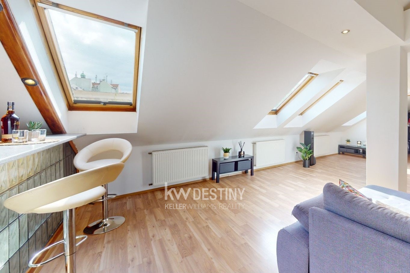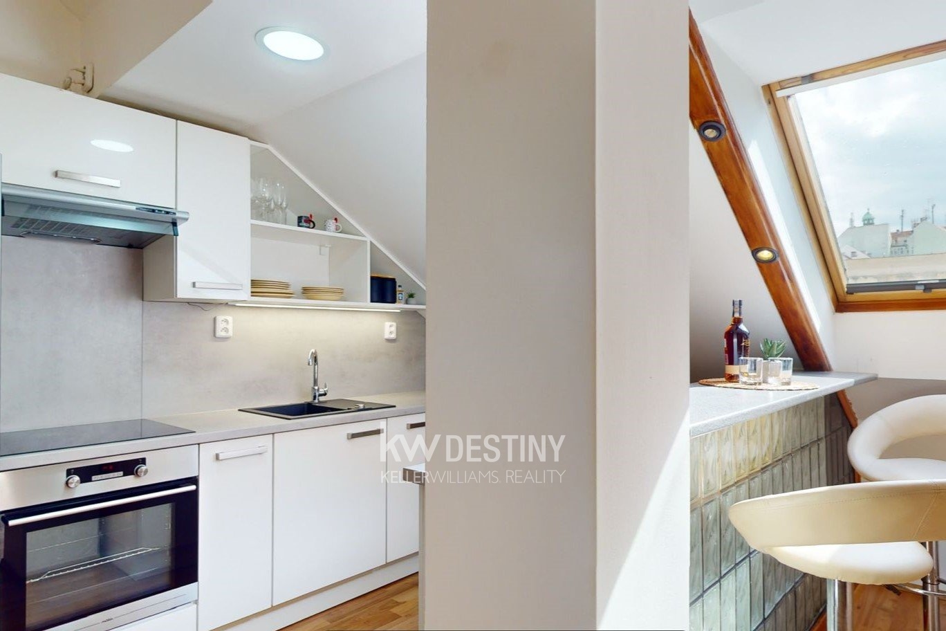 Kuchyňská linka na míru ve vyšším standardu je vybavena elegantním proskleným barem a všemi potřebnými spotřebiči – elektrická trouba a sklokeramická deska, digestoř a vestavná myčka. V bytě zůstává rovněž pohodlný gauč, televizní stěna, skříně, postel i s matracemi. Podlahy jsou plovoucí, okna plastová i střešní dřevěná, osazená vnitřními roletami typu plisé a den-noc. Interiérové dveře kombinují masivní dřevo s kvalitními MDF obložkami.