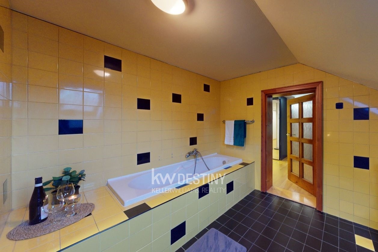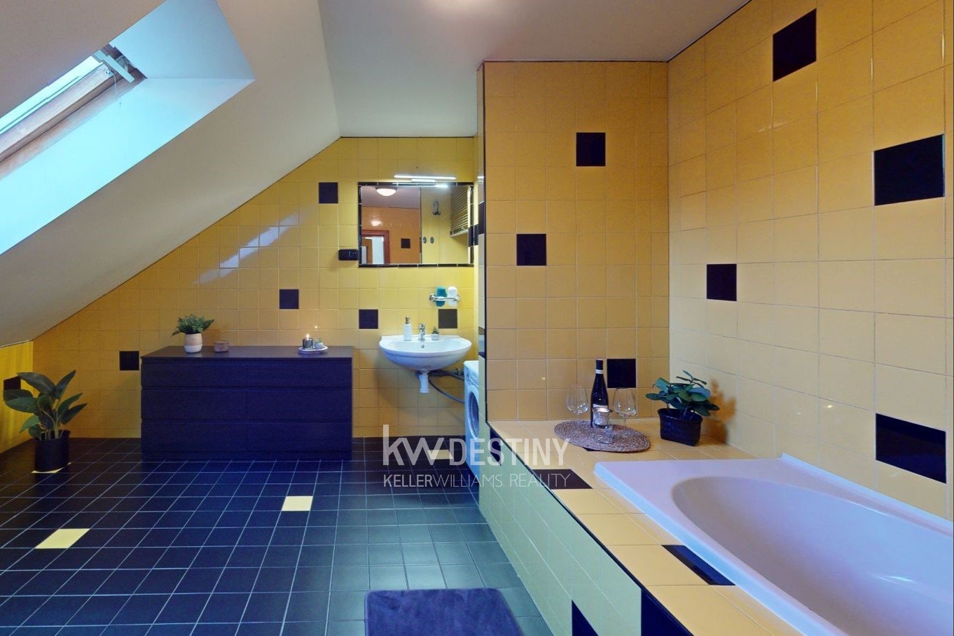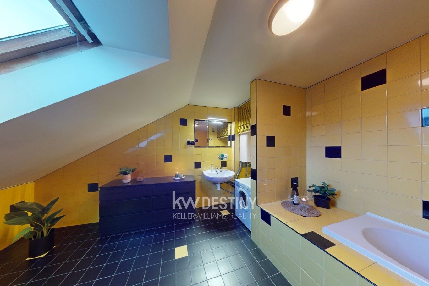 Koupelna je přístupná z chodby a disponuje vanou, dostatečným prostorem pro pračku i sušičku. Umístěn je zde také plynový kotel, který zajišťuje jak ohřev vody, tak vytápění celého bytu.