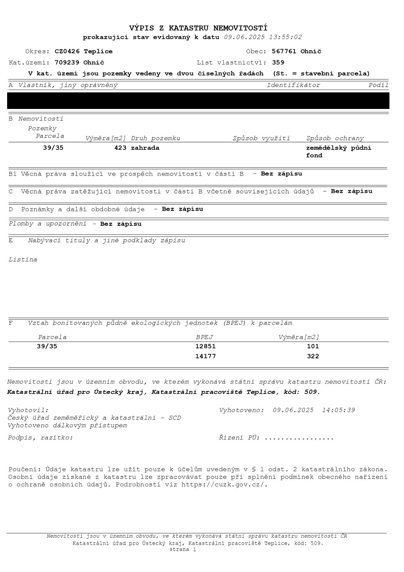 Zahrada představuje ideální spojení klidu a praktičnosti. Najdete zde kombinaci ovocných a dekorativních stromů, jako jsou jabloně, špendlíky či škumpa. Podle oficiálních dat je menší část pozemku (101 m²) tvořena vysoce úrodnou půdou, zatímco zbylá část (322 m²) je vhodná pro pěstování méně náročných plodin. Díky přípojkám elektřiny a vody z řádu, které se nacházejí přímo na hraně pozemku, je zajištěno snadné a nízkonákladové napojení na inženýrské sítě. Odpady lze řešit zřízením vlastní čističky odpadních vod. Parkování je pohodlně zajištěno v oploceném areálu zahrádkářské kolonie, ke kterému vede zpevněná cesta umožňující příjezd autem až přímo k pozemku. Na nemovitosti neváznou žádné právní vady.